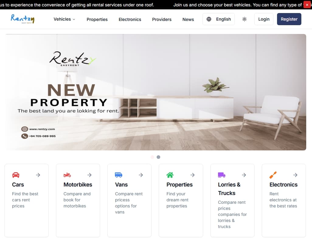 Introducing Rentzy, your one-stop digital platform for all things rental! Connect with trusted providers to rent vehicles, properties, electronics, and more all in one place. Discover exclusive offers, book instantly, and simplify your rental experience.